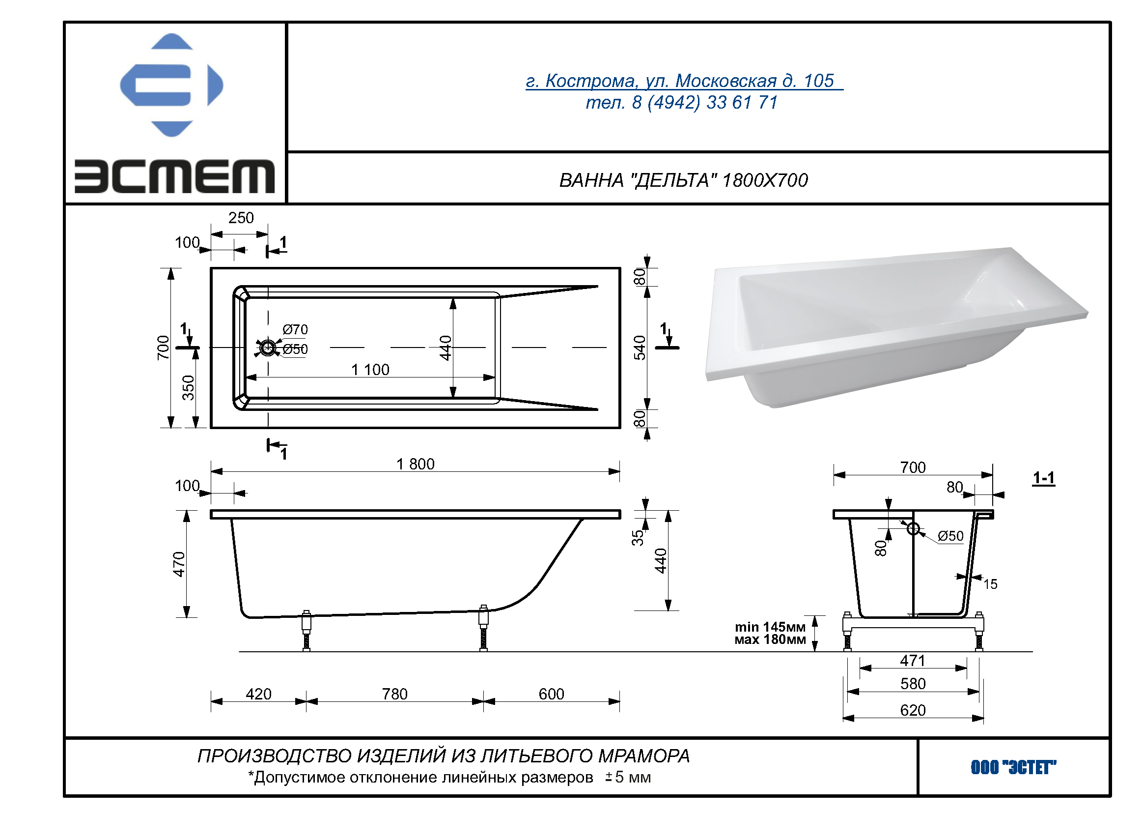 Большая ванна «Эстет Дельта» 180х70, изготовленная из литьевого мрамора. Очень вместительная ванна, в которой можно будет со всеми удобствами расположиться после трудового дня или поиграть в воздушных пузырьках со своим ребенком. Российский продукт, не уступающий по качеству европейским аналогам, но имеющий очень привлекательную цену.